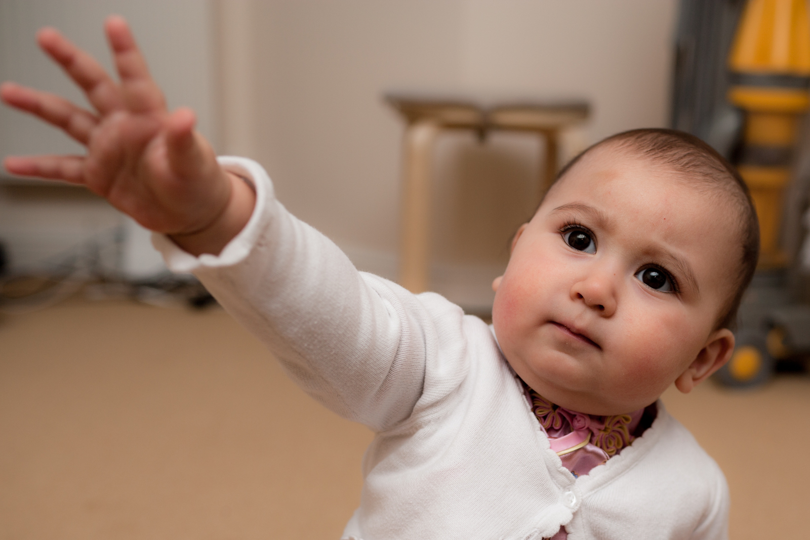 Thing I can do now include:  almost walking (I’ve managed about 3 steps on my own…); eating just about anything (Daddy lets me eat what he is eating..); smiling and laughing; switching the TV on and off with the remote control; and kissing.
