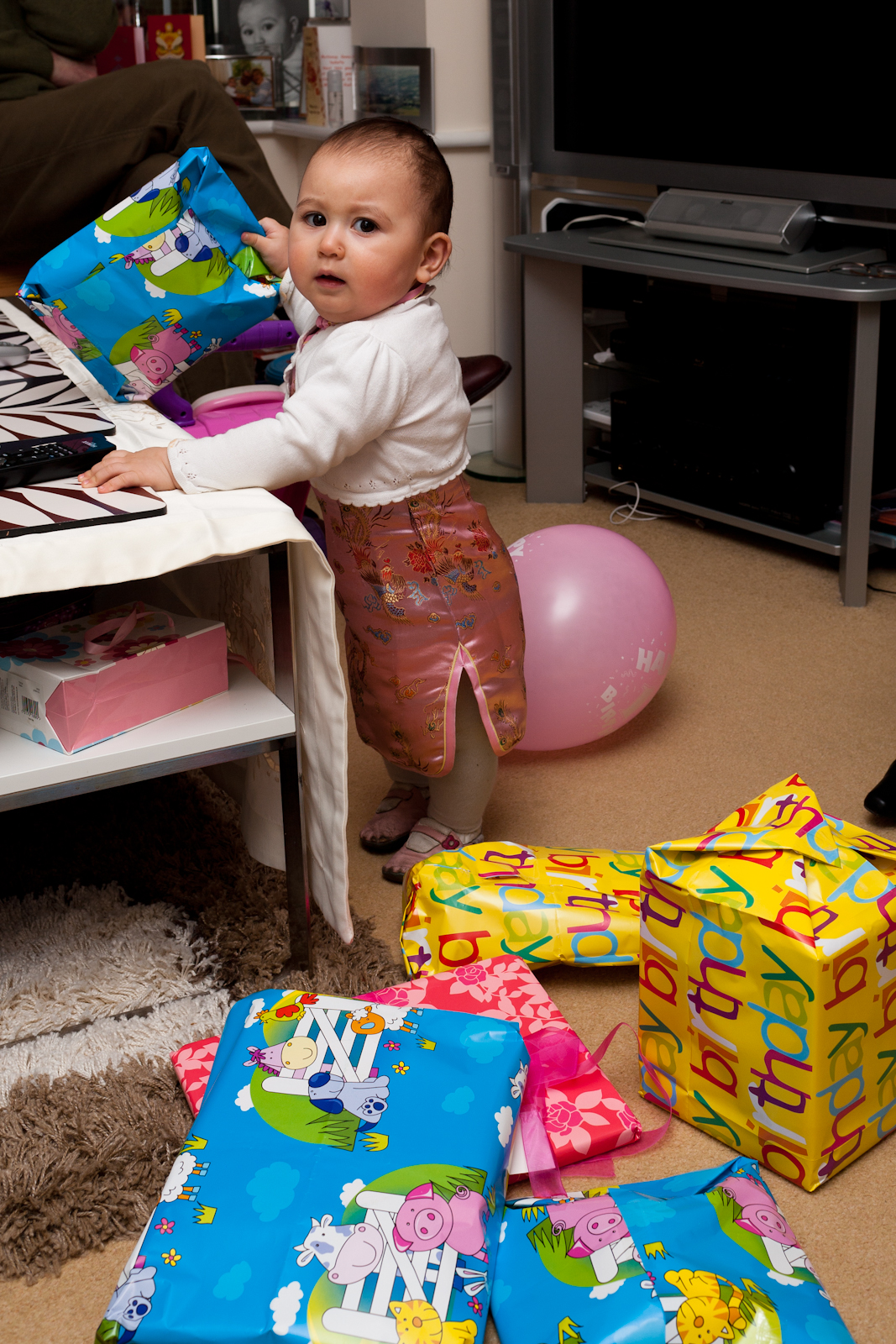 Mummy has arranged 3 birthday parties for me!  The first one was on Saturday – lots of family came all the way from Yorkshire to see me!  There was Grandad David and Grandma Julie; Great-Grandad Bryan and Great-Grandma Rita; and Great Auntie Social and Great Uncle Bulgaria.  They brought me lots and lots of presents (mainly toys) and cards.  Thanks also to everyone else who sent cards and presents, I really like the loud presents, although Daddy said something about getting something very noisy in revenge when it’s my cousin Jessica’s birthday!